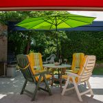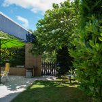 Garten Durch die Terrassentüren können sie den Garten erreichen mit Terrasse, Gartenmöbel, Tisch, Stühle und Liegestühle. Und es gibt ein Sonnenschhutz.
