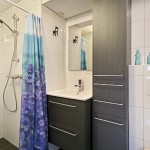 De badkamer is voorzien van douche, wastafel, spiegel en toilet.