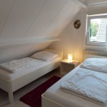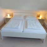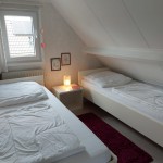 In der oberen Etage gibt es drei Schlafzimmern mit Laminatboden (1, 2, 3) und eine zweite, separate Toilette. Schlafzimmer (1) ist etwas größer als die anderen beiden Schlafzimmer und hat ein Doppelbett (180×200 cm), einen Einbauschrank und ein Waschbecken. Das Schlafzimmer (2) je 2 Einzelbetten (90×200 cm) und eine Kleiderschrank. Das Schlafzimmer (3) je 2 Einzelbetten (90×200 cm) und eine Kleiderschrank. Alle Matratzen haben Matratzenschoner, Decken und Kopfkissen.