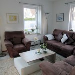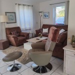 Couchgarnitur: 3 + 2 sitzer, 1 Sessel und Couchtisch, Stehlampe (groß und Klein) Schranken usw. Flatscreen Fernseher mit Kabelanschluss und Sat-Antenne, Radio und Frei Wifi.