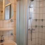 Sanitärbereich Ebenerdiges Badezimmer mit Dusche, Waschbecken, Toilette und einem kleine Schrank. In Obergeschoss befindet sich eine separate Toilette mit kleinem Waschbecken.