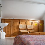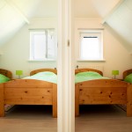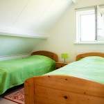 Bovenverdieping: Op de bovenverdieping bevinden zich drie slaapkamers, en een aparte toilet met wasbak. Aan de trap bevind zich een kinderhekje. Er is een grote slaapkamer met een tweepersoons bed, wastafel, 2 stoelen, inbouw kastenwand, nachtlampjes en boeken. De twee andere slaapkamers hebben twee eenpersoons bedden, nachtlampjes en vaste kasten. Alle bedden zijn voorzien van eenpersoons dekbedden en kussens.