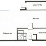 Benedenverdieping: Wanneer u via de voordeur binnenkomt komt u in de hal terecht met gaderobe, van hieruit heeft u toegang tot de betegelde badkamer met douche, wastafel, de woonkamer, keuken, WC, meterkast, en een vaste trap naar de bovenverdieping, de gehele beneden verdieping is voorzien van plavuizen.