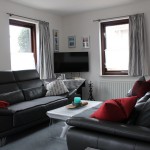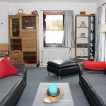 Wohnzimmer Leder-Designer-Sofa (2 und 3 Sitzer), Nierenkissen, Lederhocker, Wohnzimmertisch, Stehlampe (groß und Klein), SMART-SAT-TV mit internationalen Programmen, Blu-Ray-DVD-Player, diverse Spiele und Bücher, WLAN – Internet.