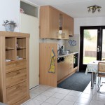 Küchenbereich In der Küche ist ein kompletter Küchenblock eingebaut, Hänge- und Unterschränke, Spülbecken, Geschirrspülmaschine, Dunstabzugshaube mit Wrasenabzug, sowie ein 4-fl. Elektroherd mit Ceranfeld und, Backofen, Mikrowellengerät mit Grill, Kaffeemaschine, Wasserkocher, Toaster, Kühlschrank mit Gefrierfach, Töpfen und Pfannen, für 6 Personen ausreichend Geschirr, Gläser, Bestecke, großem Tisch für bis zu 6 Personen mit passenden Stühlen. Durch die Terrassentür erreichen Sie den großen umschlossenen Garten.