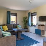 Wohnzimmer Siena Lounge-Garnitur inkl. Polsterauflagen, Longesessel mit Hocker und Polster, Wohnzimmertisch, Stehlampe (groß und Klein), SMART-SAT-TV mit internationalen Programmen, DVD-Player, diverse Spiele und Bücher, WLAN – Internet.