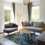 Großer modern eingerichtetes Wohnraum, Im Wohnzimmer ist eine Flatscreen TV,mit deutschen Programmen, eine gemütliche sitzkombination,, Couchtisch, Offenes Kamin, Schranken, wlan internet, bodenhohe Fenster und große Tür zur geräumig plattierten Außenterrasse mit Übergang zum Vorgarten