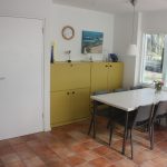 een eettafel met 6 stoelen en een kast. De Flatscreen TV is aangesloten op de kabel van het park met Nederlandstalige,