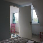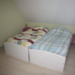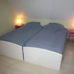 Er is een grote slaapkamer met twee eenpersoons bedden 90 x 200 die tegen elkaar aan staan en een kast.