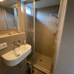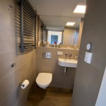Badezimmer mit Dusche, Waschbecken, Toilet und Wasbecken.