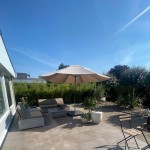 Vom Esstisch aus guckt man in den schone Garten mit Terasse.