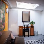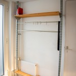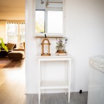 Garderobe mit spiegel, Tisch, Grosse schränk und Waschmaschine.