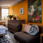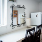 ein kleiner Schreibtisch, Schrank mit schubladen, Spiegel, Lampen, 3 Stuhlen und ein Gefrierbox.