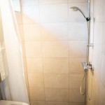 Badezimmer mit Dusche, Waschbecken und Wastisch