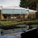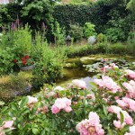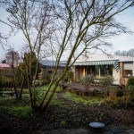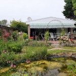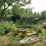 Vom Esstisch aus guckt man in den schone Garten mit Teich und Terasse.