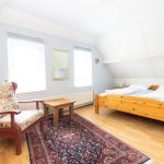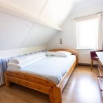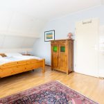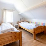 In der oberen Etage gibt es drei Schlafzimmern mit Laminatboden und einem Toilette. Große Schlafzimmer (1) ist etwas größer als die anderen beiden Schlafzimmer und hat ein Doppelbett (180×200 cm) einen Einbauschrank und ein Waschbecken. Das Schlafzimmer (2) hat zwei Einzelbetten (90×200 cm) und einen Einbau Kleiderschrank. Das Schlafzimmer (3) verfügt Uber 1 Einzelbett (140×200 cm) und einen Einbauschrank. Alle einzelne Matratzen haben Matratzenschoner, und alle Betten haben Decken und Kopfkissen.