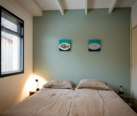 1 Doppelbett (160 x 200 cm) mit zwei separaten Matratzen (80 x 200 cm) und einem Wäscheschrank;