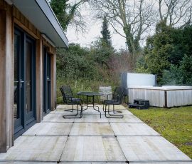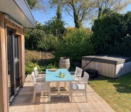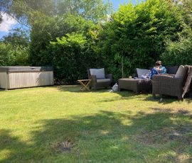 einer Küche, einem Badezimmer mit WC, zwei Schlafzimmern und einem großen Garten mit Terrasse und Whirlpool.