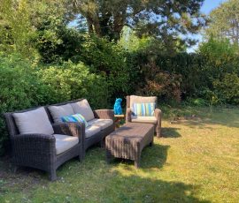 Zahlreiche Gartenmöbel und eine Rattangarnitur sorgen für viel Privatsphäre.