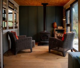 Es gibt eine Sitzecke mit Beistelltischen, einen Kaminofen und zwei Rattanstühle etc.