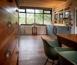 In der geräumigen offenen Küche finden Sie einen Essbereich mit Stühlen,