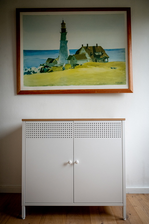Badezimmer mit WC, Waschbecken und Schränken. Im Zählerschrank neben dem