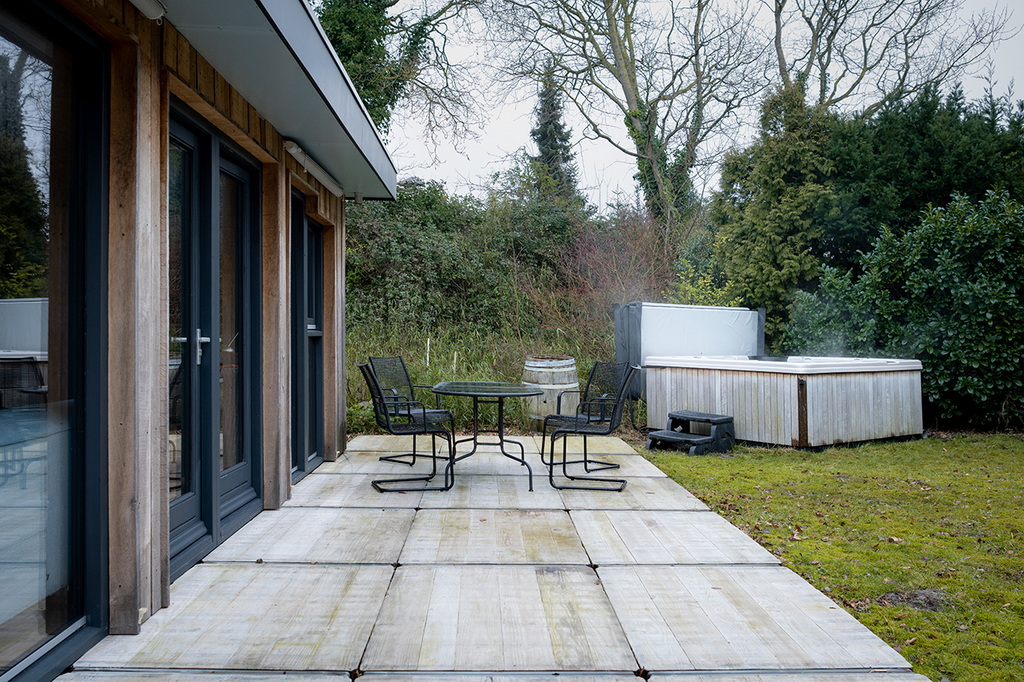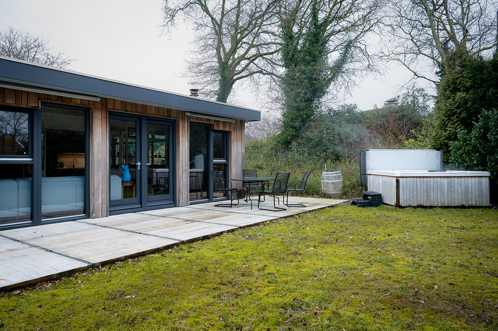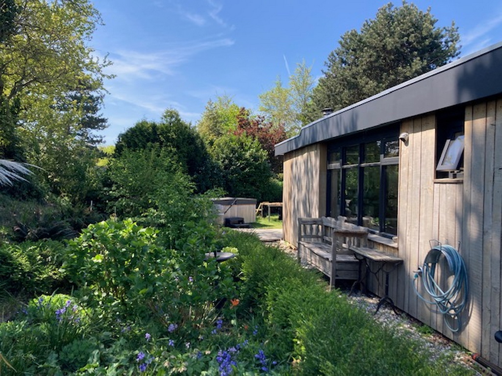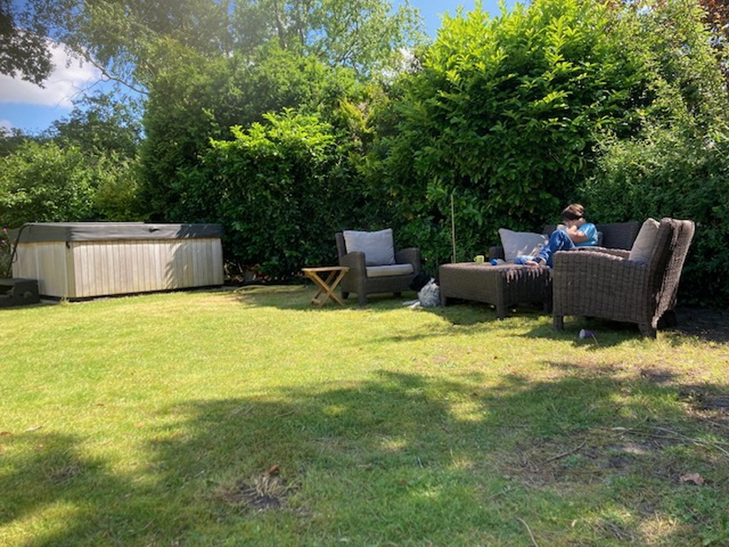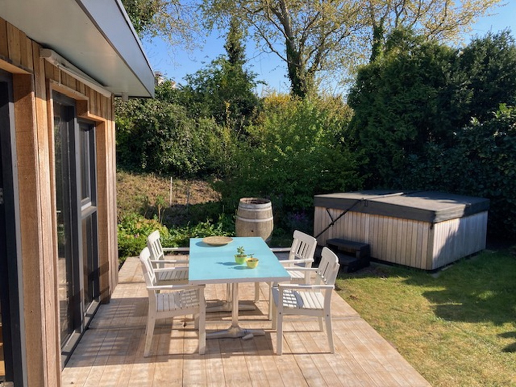 einer Küche, einem Badezimmer mit WC, zwei Schlafzimmern und einem großen Garten mit Terrasse und Whirlpool.