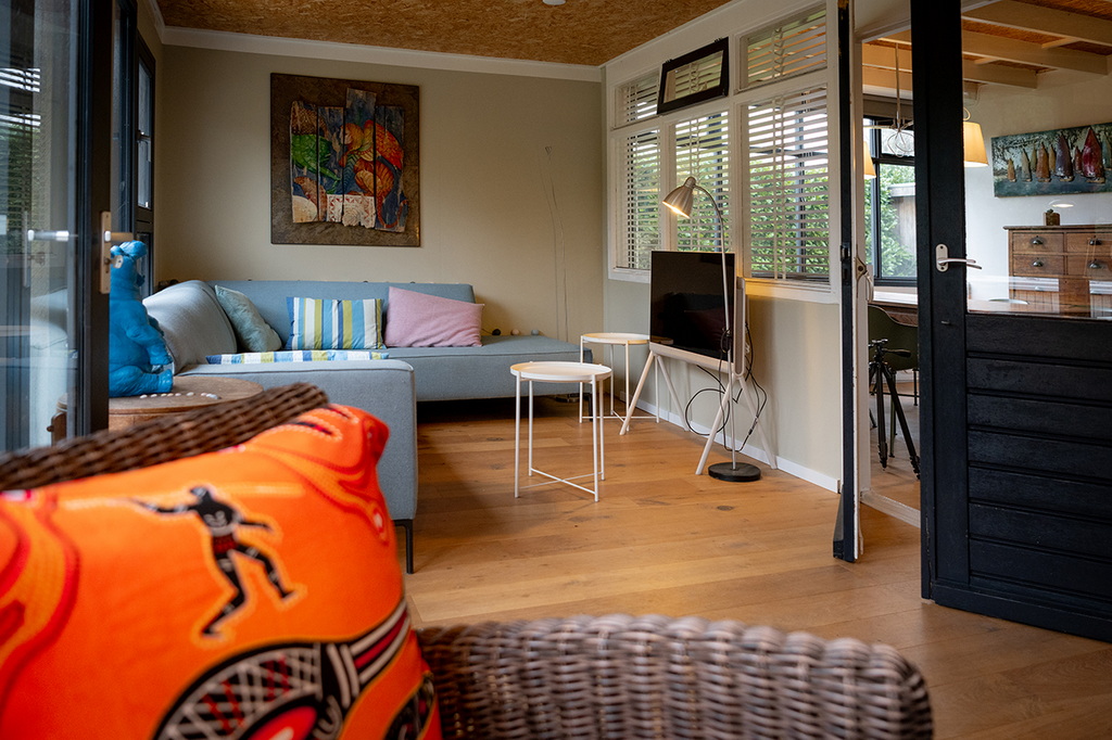 Smart-TV mit Kabelfernsehen (niederländische Sender) und kostenlosem WLAN, Schränke und diverse Lampen.