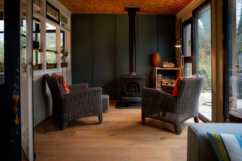 Es gibt eine Sitzecke mit Beistelltischen, einen Kaminofen und zwei Rattanstühle etc.