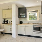 In der Küche finden Sie einen, gaskochplatte mit Backofen, kombiMikrowelle, Senseo Apparat, Wasserkocher, Toaster, Abzug und Kühlschrank mit Gefrierfäch. Vom Esstisch aus guckt man in den schone Garten mit Terasse.