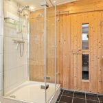65 m² woonoppervlakte met Sauna, badkamer met een douchecabine, halfrond bubbelbad en toilet.