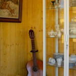 Tisch mit 4 Stühlen, Schrank, Keyboard, Gitarre.