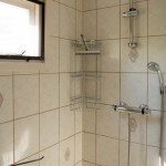 1 Badezimmer mit Dusche, Waschbecken und separater Toilette.