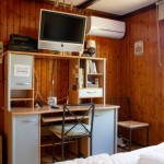 und einen großen Wandschrank, Waschbecken mit Schrankwand, Spiegel, Schreibtisch mit Stuhl und Klimaanlage.