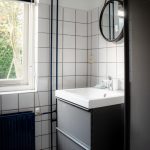 Ebenerdiges Badezimmer mit Dusche, Spiegel, Waschbecken und einem Schrank.