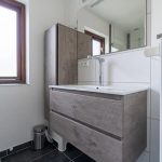 Waschbecken, Föhn und kleinem Schrank, und Eine separater Toilette mit Waschbecken.