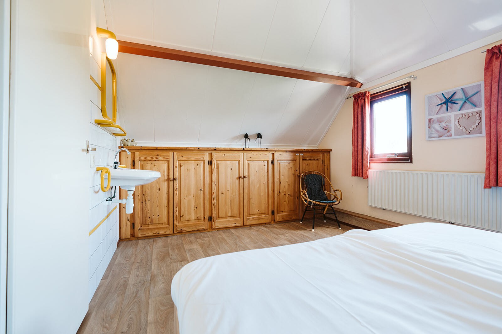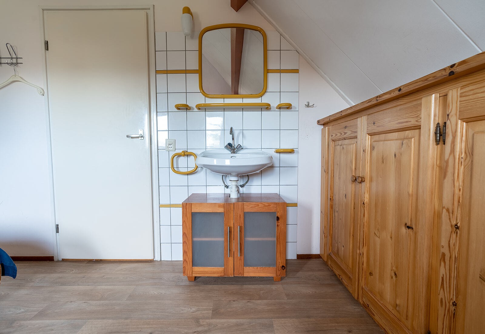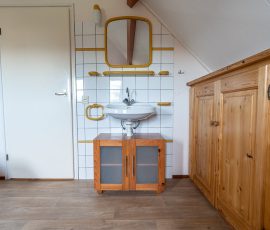 Im dem großen Schlafzimmer befindet sich ein Waschbecken mit Spiegel.