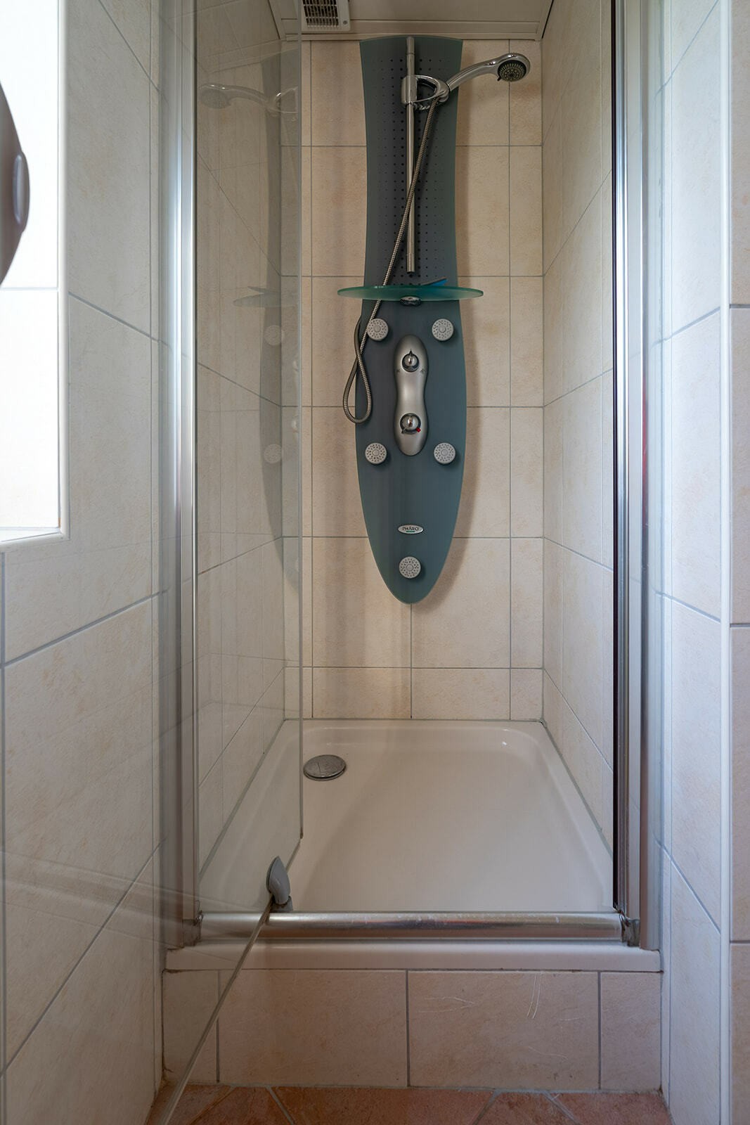 Ebenerdiges Badezimmer mit Dusche mit verschiedenen Massagedüsen, Waschbecken, Föhn und schrank.