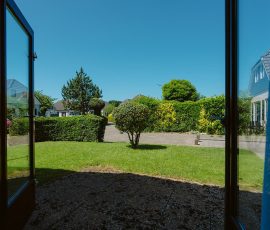 großer Tisch mit passenden Stühlen. Durch die doppelseitige Terrassentür erreichen Sie den großzügigen sonnigen Garten.
